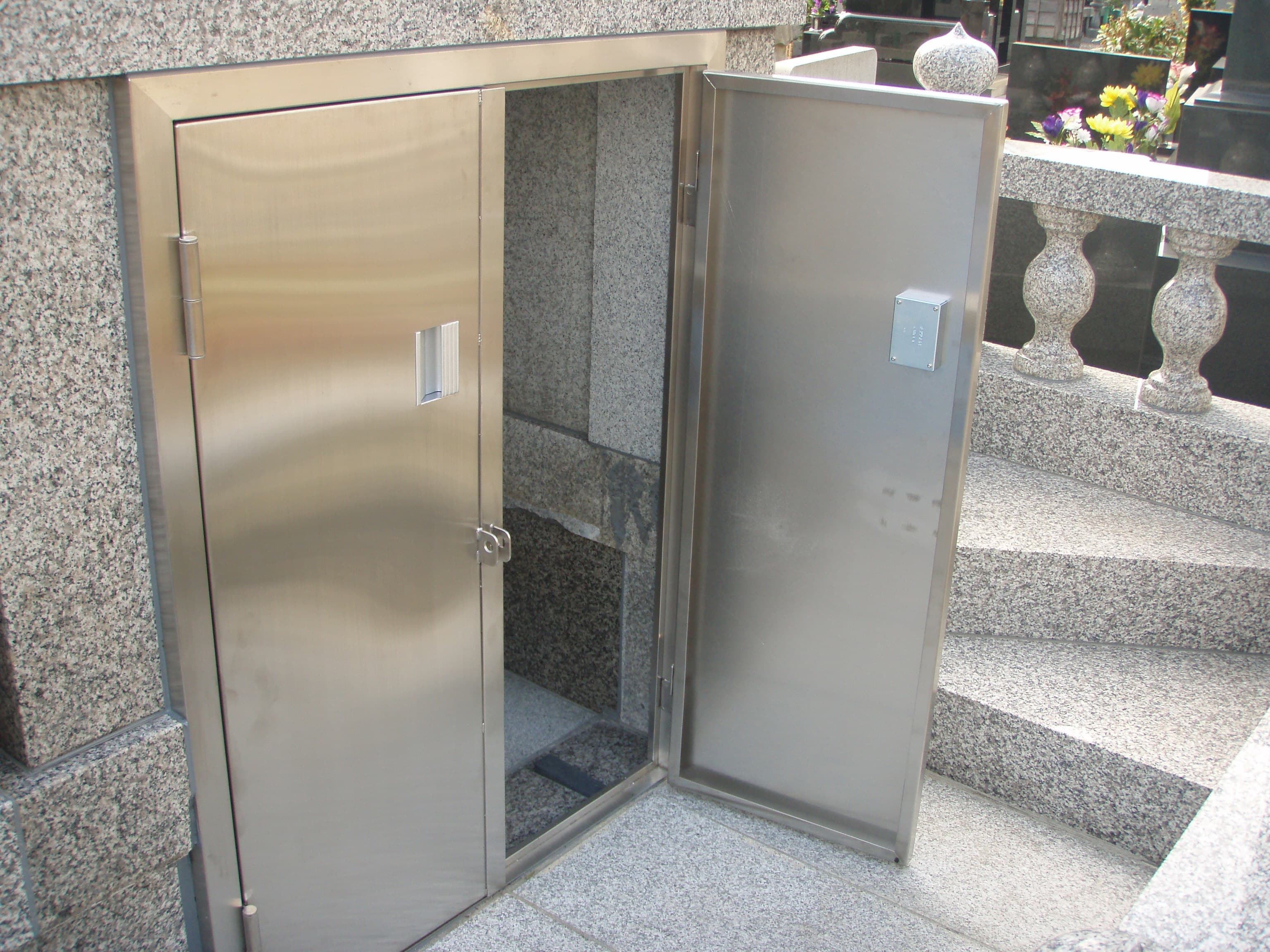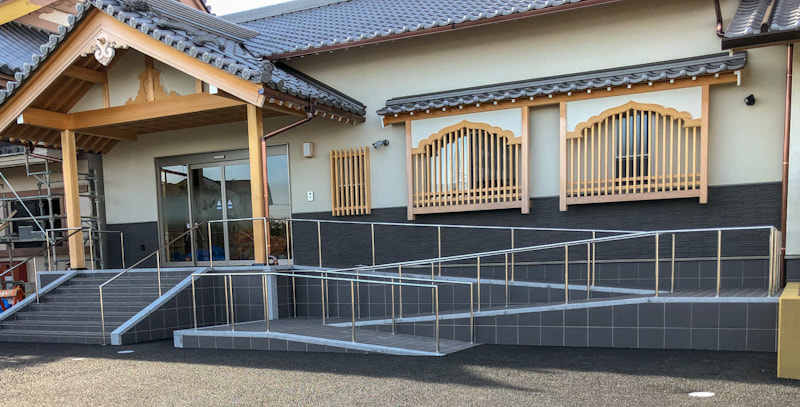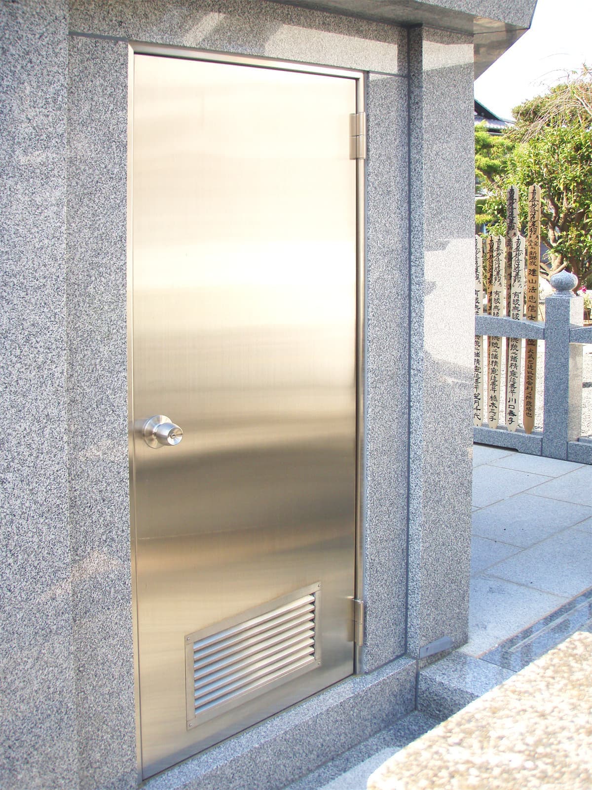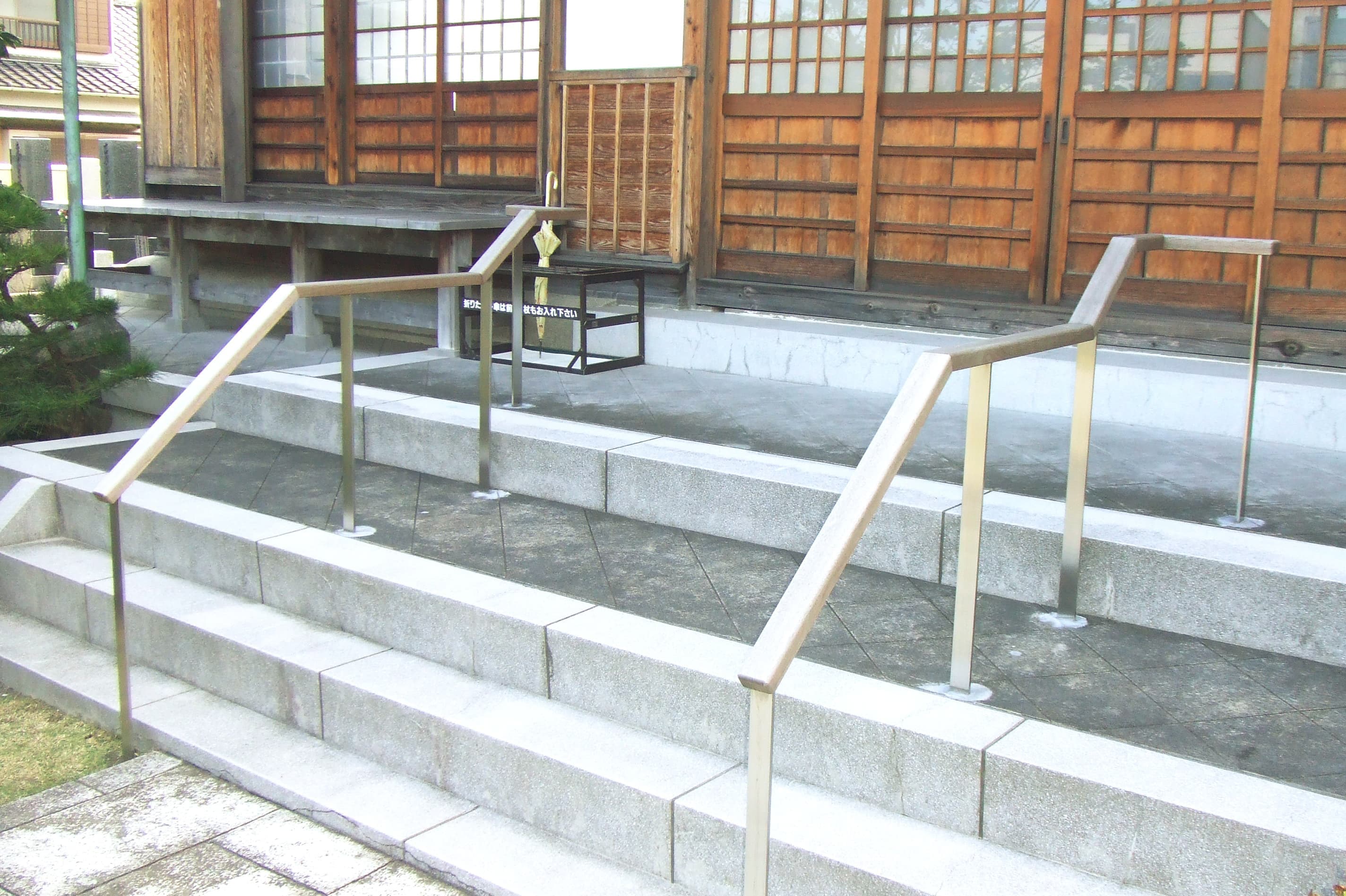 石とステンレスのコラボレーションが、寺院の風格をさらに高めます。