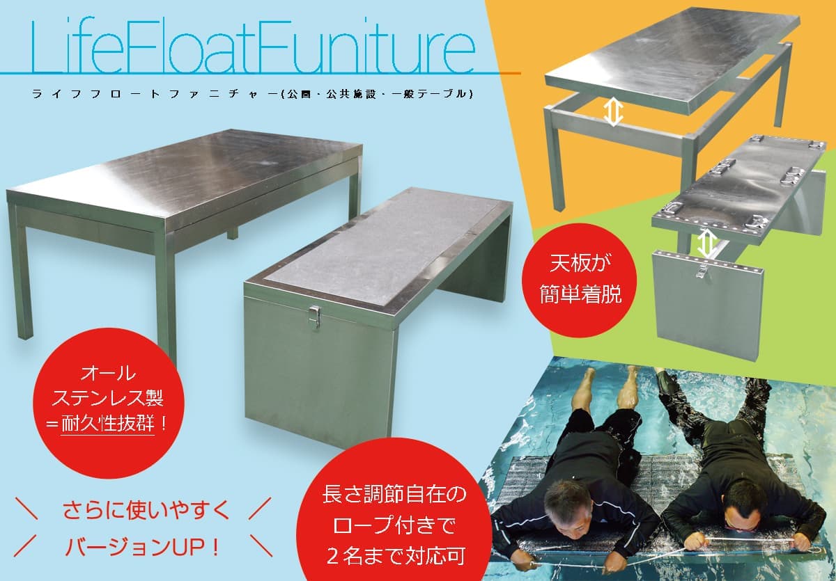天板となるパネルの試作品の開発を経て、現在はその天板を使用した『テーブルおよび長椅子』を試作(それぞれ脚部は救命筏として使用の際に着脱できる構造)、